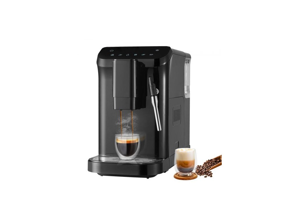 Automatický espresso kávovar VEVOR, 20barový automatický kávovar s napěňovačem a parní tryskou, vestavěným mlýnkem a 15stupňovým nastavením mletí, profesionální espresso kávovar s 1,5l nádrží na vodu