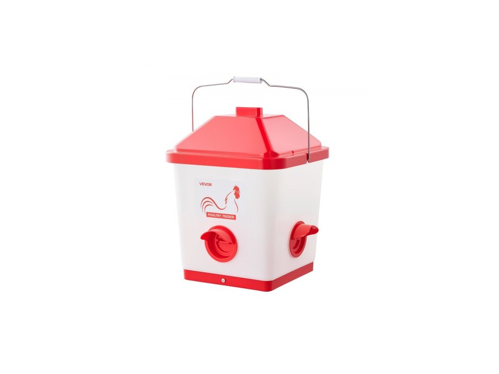 Automatický krmítko pro kuřata VEVOR, kapacita 18,14 kg, velký závěsný dávkovač krmítka pro drůbež s rukojetí, bezodpadové provedení, odolné proti dešti, 3 krmné otvory, uvnitř nebo vně kurníku, pro kuřataZajistěte čisté krmivo pro vaši drůbež
