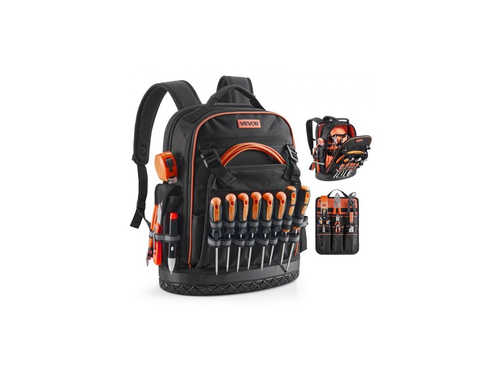 Batoh na nářadí VEVOR, 64 kapes, organizér na nářadí pro náročné pracovní účely s přihrádkou na notebook a tvarovanou základnou, batoh pro elektrikáře, opraváře a techniky HVAC
