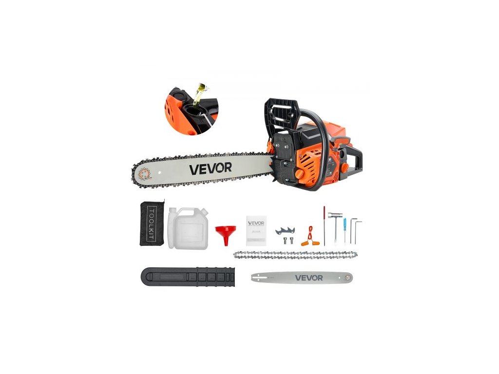 Benzínová řetězová pila VEVOR 58 ccm, benzínová řetězová pila 20 palců, motorová pila o výkonu 2,7 HP s protiskluzovou rukojetí, benzínové řetězové pily s dvojitou palivovou nádrží, pro řezání dřeva, prořezávání stromů a čištění pozemků
