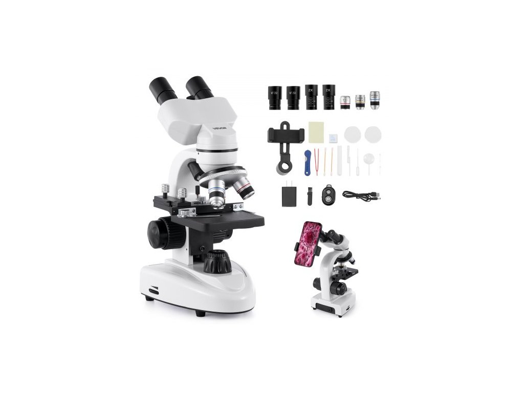 Binokulární mikroskop VEVOR pro dospělé, profesionální sada složené mikroskopie se zvětšením 40–2000x, tělo z hliníkové slitiny, včetně LED světla a držáku na telefon, pro laboratoř, školu, domácnost a vzděláváníUltra jasné zvětšení 40X-2000X