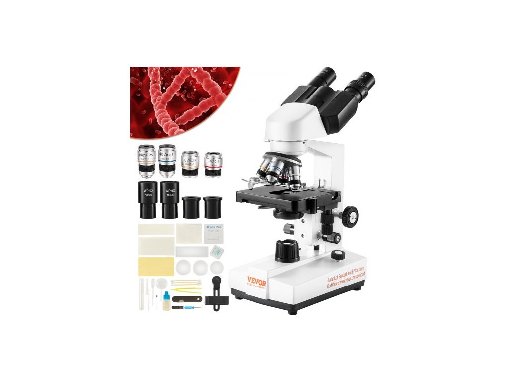 Binokulární složený mikroskop VEVOR, zvětšení 40X–2500X, binokulární složený laboratorní mikroskop s LED osvětlením, dvouvrstvý mechanický stolek, včetně držáku na telefon a podložních sklíček.