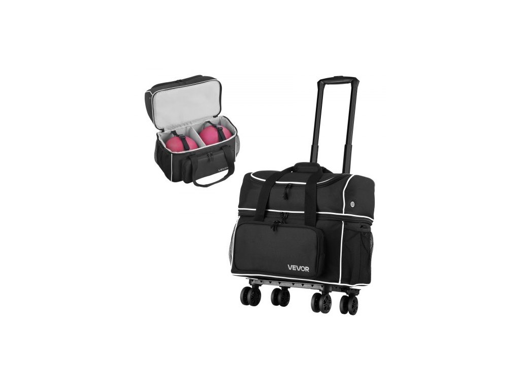 Bowlingová taška na koule VEVOR, bowlingová taška na 2 koule a čtyři válečky s kolečky, se samostatnou přihrádkou na boty (až do velikosti US 16) a velkou kapsou na příslušenství, zatahovací rukojeť s délkou až 950 mm.