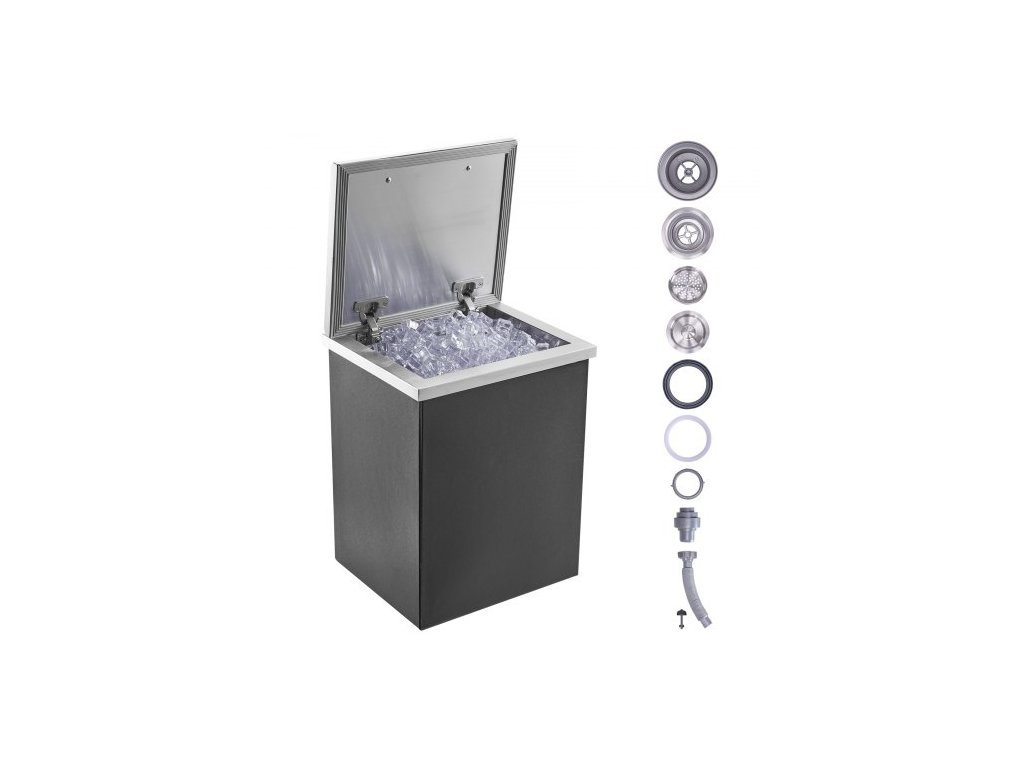 Chladič ledu VEVOR, nerezová ocel, 35,5 cm D x 30,5 cm Š x 45,5 cm V, komerční nádoba na led s výklopným víkem, venkovní kuchyňský ledový bar o objemu 40 qt, odtoková trubka a vypouštěcí zátka součástí balení, na studené víno a pivoVestavěná úložná truhla na led