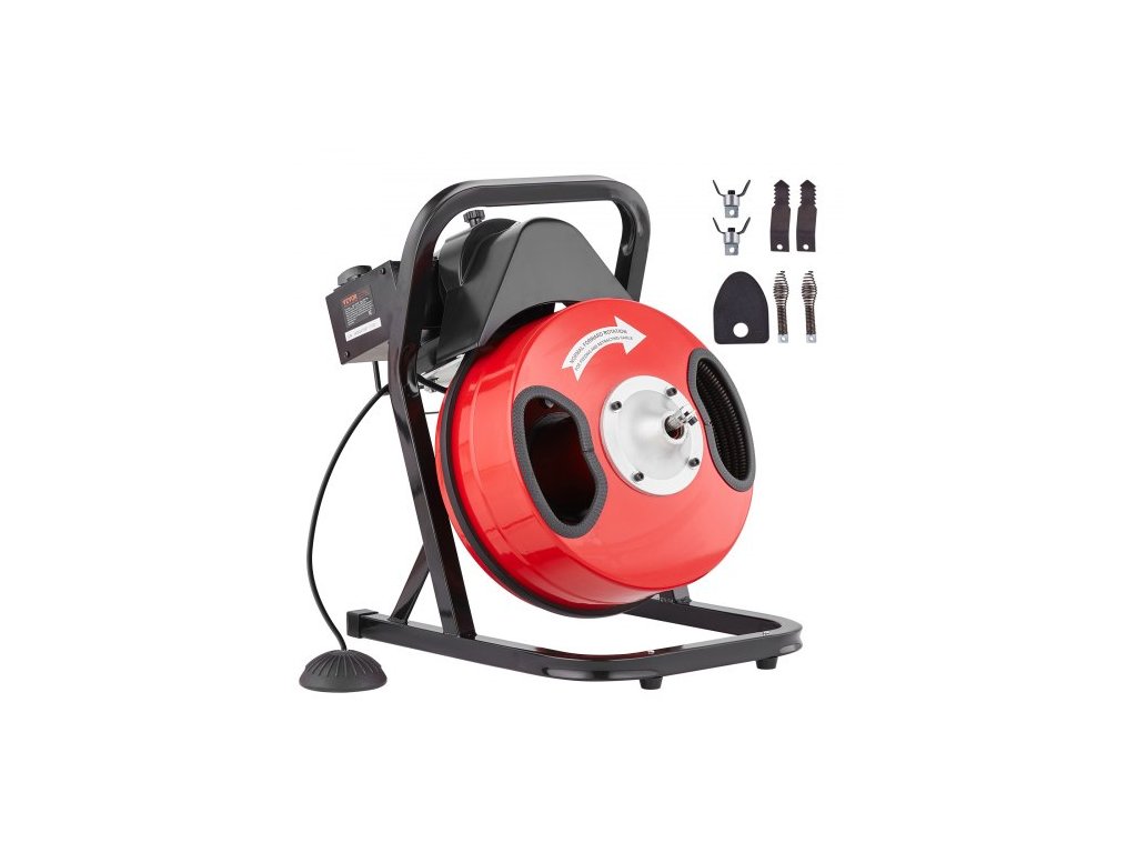Čistič odpadů VEVOR 15,2 m x 1,2 cm, ruční podávání kanalizačního šneku - se 4 řeznými zuby a vzduchem aktivovaným nožním spínačem pro potrubí o průměru 2" až 4