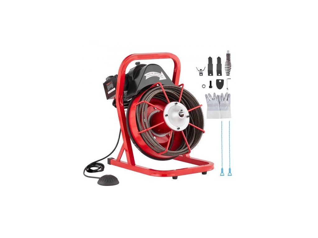 Čistič odpadů VEVOR 50 stop x 3/8 palce, ruční podávání šnekového dopravníku, elektrický čistič odpadů 250 W se 4 řeznými noži a vzduchem aktivovaným nožním spínačem pro potrubí o průměru 2" až 4
