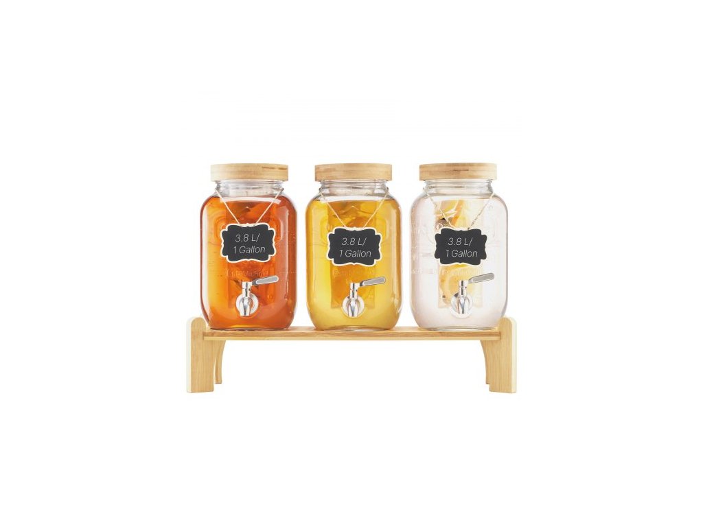 Dávkovač nápojů VEVOR, balení 3 kusů, 3,8l dávkovače nápojů na párty, skleněný dávkovač džusu s dřevěným stojanem, kohoutek z nerezové oceli, nálevník, dávkovač ledového čaje, limonády a džusu na vodu na pártyNepřetržitý přísun nápojů