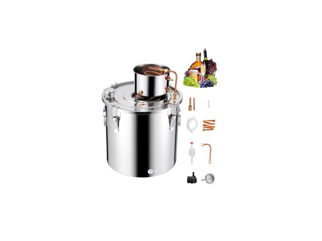 Destilační přístroj na alkohol VEVOR, nerezová ocelová palírna na vodu a alkohol o objemu 13,2 galonu / 50 l s měděnou cívkou, sada pro domácí vaření piva, rafinaci a fermentaci s teploměrem a čerpadlem, na víno, whisky, brandy, stříbrnáKompletní destilační sada