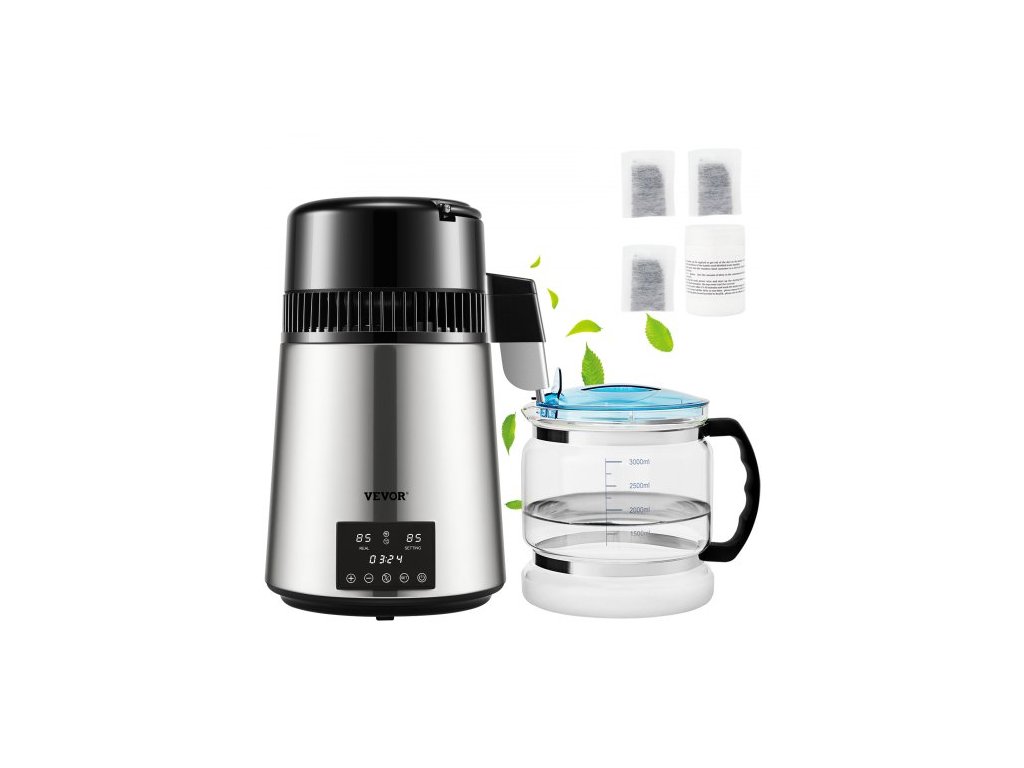 Destilátor vody VEVOR, 1 l/h, výrobník destilované vody 4 l s časováním 0-99 h, stolní čistička vody 750 W s dvojitým teplotním displejem, čisticí prášek na skleněnou karafu, 3 uhlíkové vložky, schváleno FDA, Si