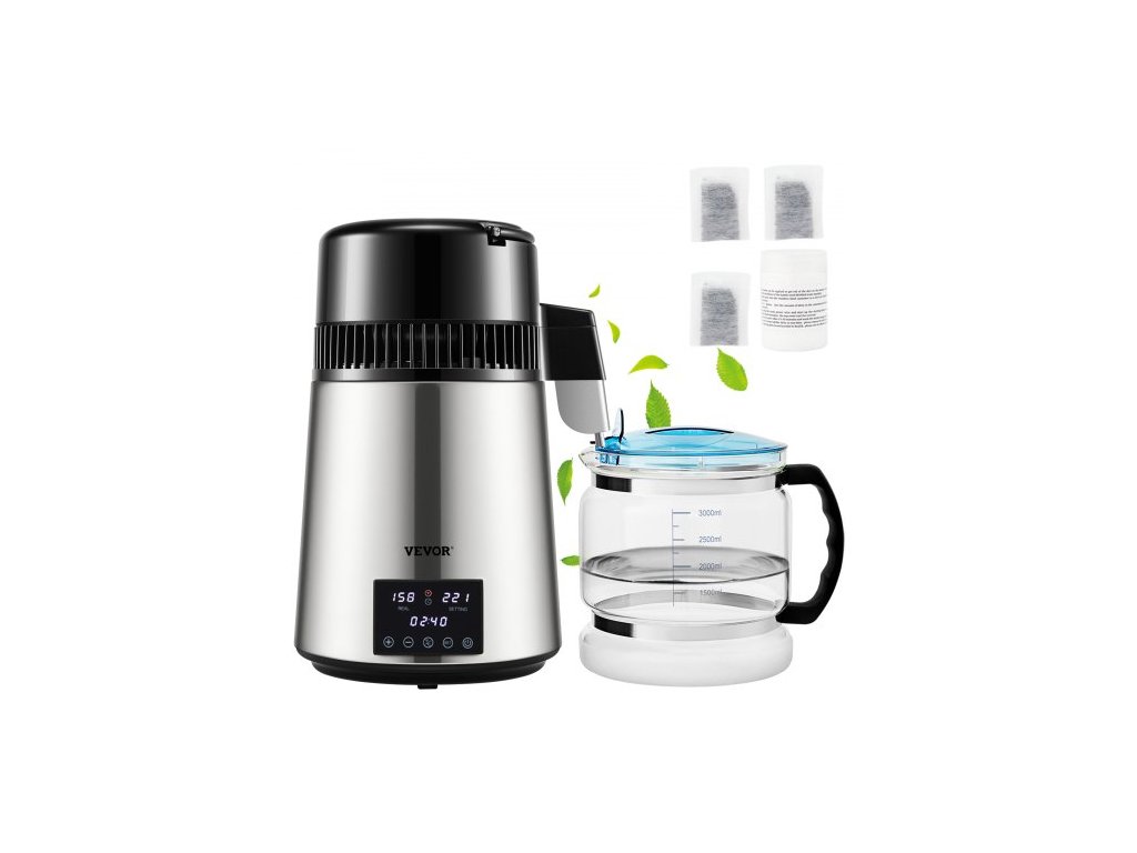 Destilátor vody VEVOR 4L, 1,5 l/h, výrobník destilované vody, časování, dvojitá teplota, stříbrná