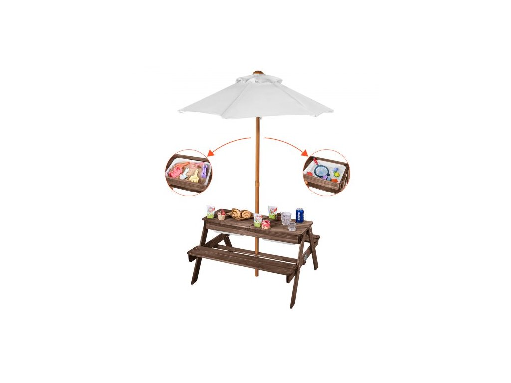 Dětský piknikový stůl VEVOR se slunečníkem, stůl 3 v 1 s pískem a vodou, venkovní dřevěný stůl a lavice se 2 tácy, jídelní nábytek pro 4 osoby na zahradu, dvůr a verandu (ořech)Jednoduchý a praktický design