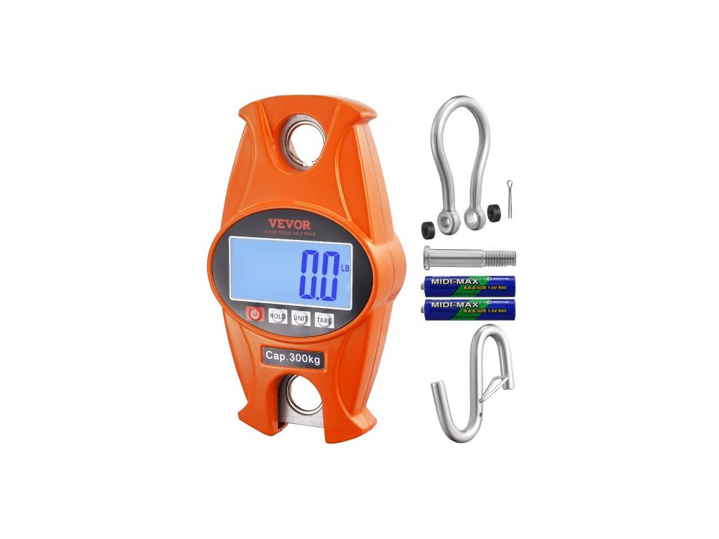 Digitální jeřábová váha VEVOR, 660 liber/300 kg, průmyslová závěsná váha pro těžké použití s pouzdrem z litého hliníku a LCD obrazovkou, ruční mini jeřáb s háky pro farmu, lov, rybaření, venkovní použití, garáž (oranžová)Správné vážení