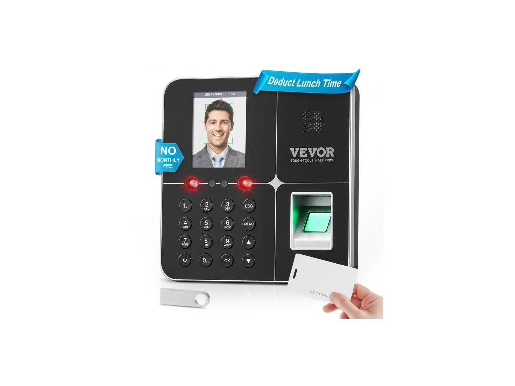 Docházkový systém VEVOR, docházkový systém pro zaměstnance s čtečkou obličeje, otiskem prstu, RFID kartami a PIN kódem v jednom, samostatný biometrický docházkový systém pro zaměstnance s 5 RFID kartami a bez měsíčních poplatků