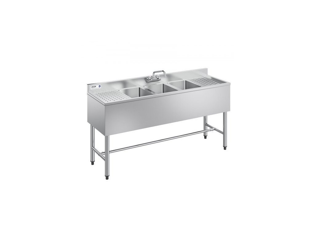 Dřez VEVOR se 3 přihrádkami, nerezová ocel 304 o průměru 18, velikost mísy 254x356x254 mm, třídílný komerční dřez pod bar s dvojitým odkapávacím otvorem a obkladem pro kuchyň, restauraci, food truck a domácí použitíČistěte více, dosahujte dále