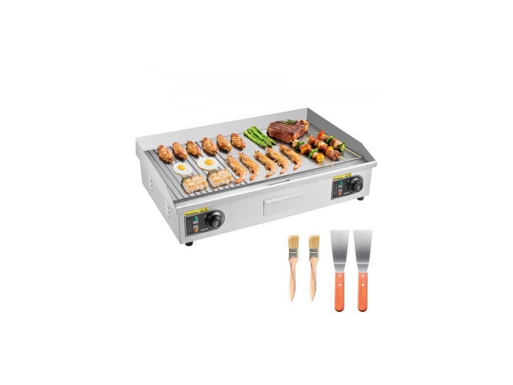Elektrická grilovací deska VEVOR pro komerční použití, 28,54 x 15,75 palce, 4400 W, nastavitelná teplota 122-570 °F, pracovní deska z nerezové oceli, z poloviny drážkovaná z poloviny plochá, se 2 špachtlemi a 2 kartáči, na steak (BEZ ZÁSUVKY)Ochrana proti stříkající vodě
