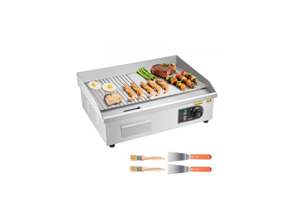 Elektrická grilovací plotýnka VEVOR pro komerční použití, 535 x 300 mm, 3200 W, nastavitelná teplota 50–300 °C, tělo z nerezové oceli, z poloviny drážkovaná z poloviny plochá, se 2 špachtlemi, 2 kartáči a 4 podložkami, na steaky a palačinkyOchrana proti stříkající vodě