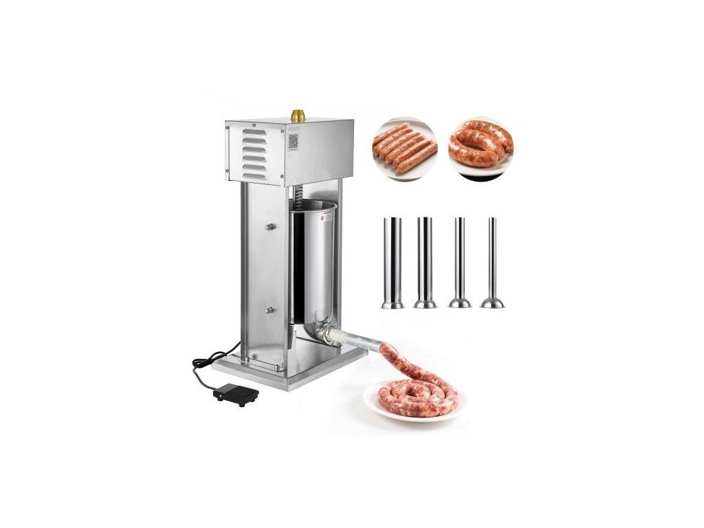 Elektrická plnička klobás VEVOR, vertikální plnička masa 25 LBS / 12 L, plynulá regulace rychlosti a nožní pedál, nerezová ocel, odolná plnička klobás se 4 plnicími trubicemi, pro komerční i domácí použití