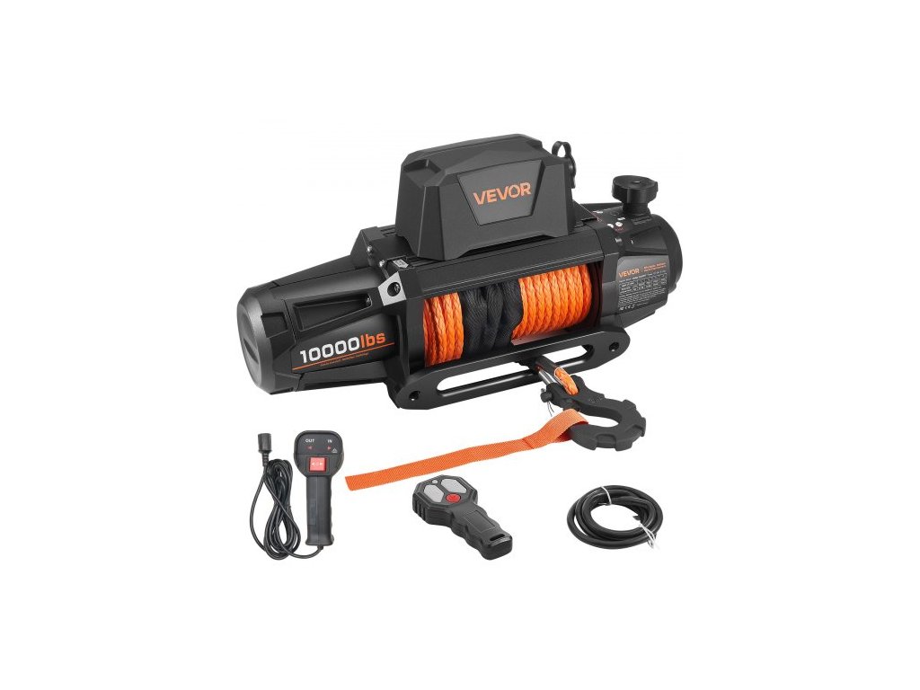 Elektrický naviják VEVOR, nosnost 4500 kg, 12V DC naviják pro nákladní vozidla se syntetickým lanem Φ8,9 mm x 27,4 m, bezdrátové a kabelové dálkové ovládání, vodotěsný IP67 pro tažení terénního SUV, jeepu, přívěsu, lodi