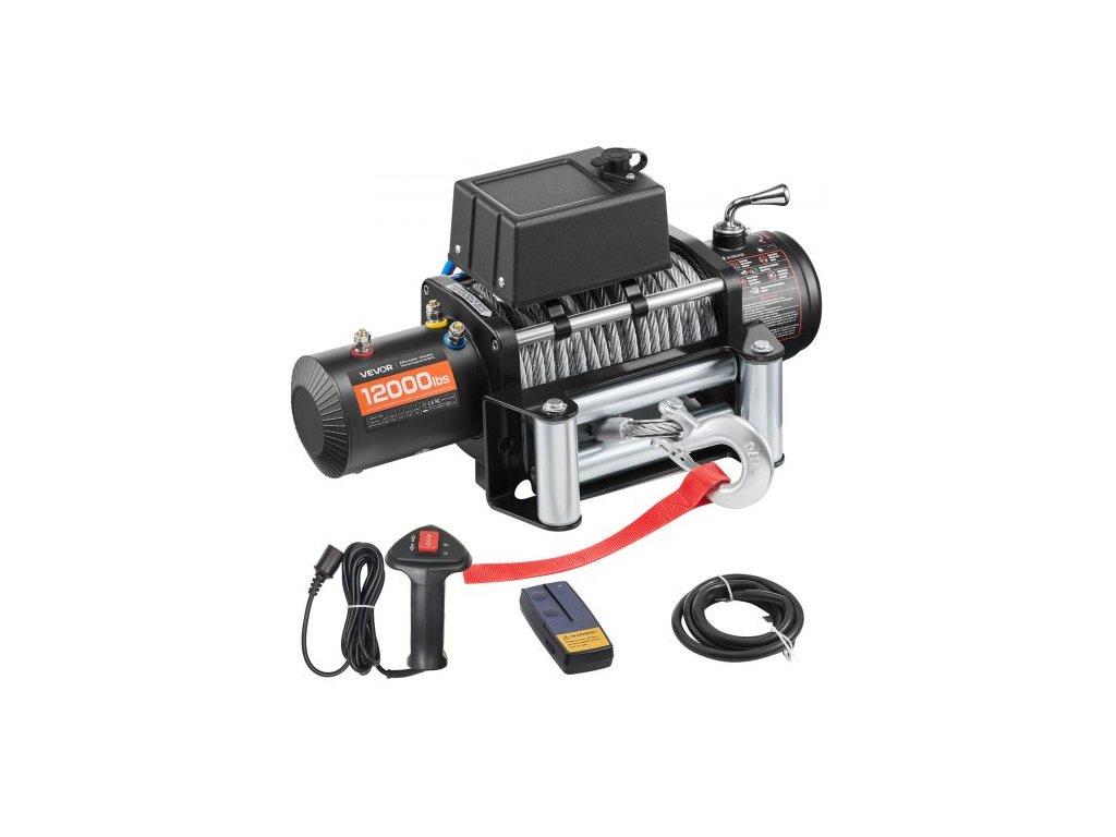 Elektrický naviják VEVOR, nosnost 5400 kg, 12V DC naviják pro nákladní vozidla s ocelovým lanem Φ9,1 mm x 26 m, bezdrátové a kabelové dálkové ovládání, vhodný pro tažení SUV, jeepu, přívěsu, lodi a terénního vozidla