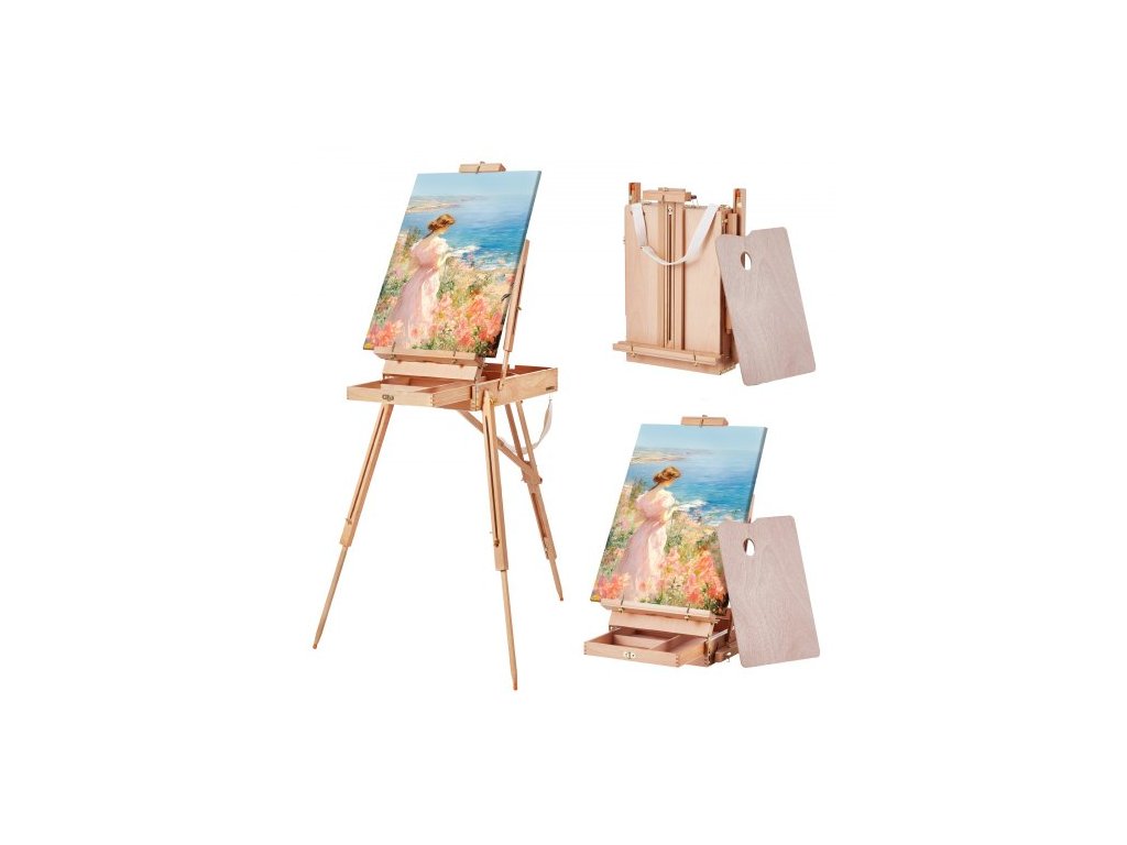 Francouzský malířský stojan VEVOR, skládací skicovací stojan z bukového dřeva s úchytem, paletou a popruhem, nastavitelný úhel a výška, přenosný dřevěný malířský stojan pro studio i do terénuSkládací umělecký stojan
