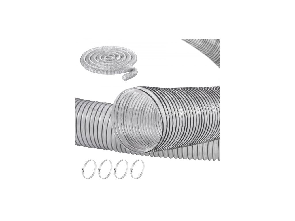 Hadice pro odsávání prachu VEVOR, 4" x 50', zesílený PVC materiál, odolný proti propíchnutí, flexibilní průhledná hadice s spirálou z uhlíkové oceli, 4 x nerezové svorky 304, pro stolní pilu, pásovou pilu, hoblík, srovnávačkuSnadná výměna
