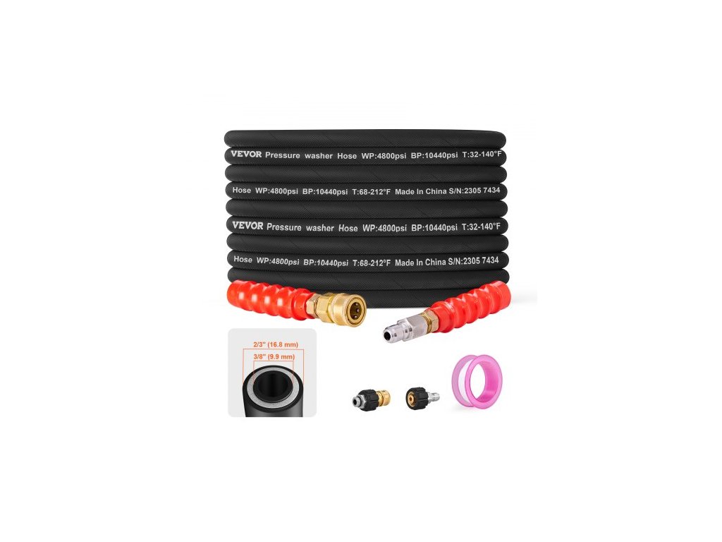 Hadice pro tlakovou myčku VEVOR, 30,5 m, bez zlomení, vnější závit 3/8"-φ14,8, vnitřní závit 3/8"-φ15, pro většinu značek tlakových myček, poloměr ohybu 4,9", prodlužovací hadice pro vysoce odolnou tlakovou myčku 4800 PSI, náhradní hadice