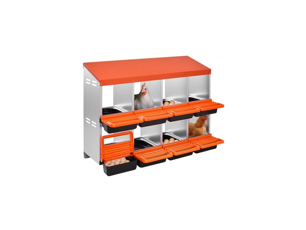 Hnízdní budka pro kuřata VEVOR, 8 přihrádek, stabilní a korozivzdorné kovové hnízdní budky o objemu 30 až 45 palců se šikmými hnízdními budkami, spodními otvory a odpočívadlovou plošinou, vhodné pro různá plemena kuřatDostatek prostoru a vhodné pro různé druhy kuřat