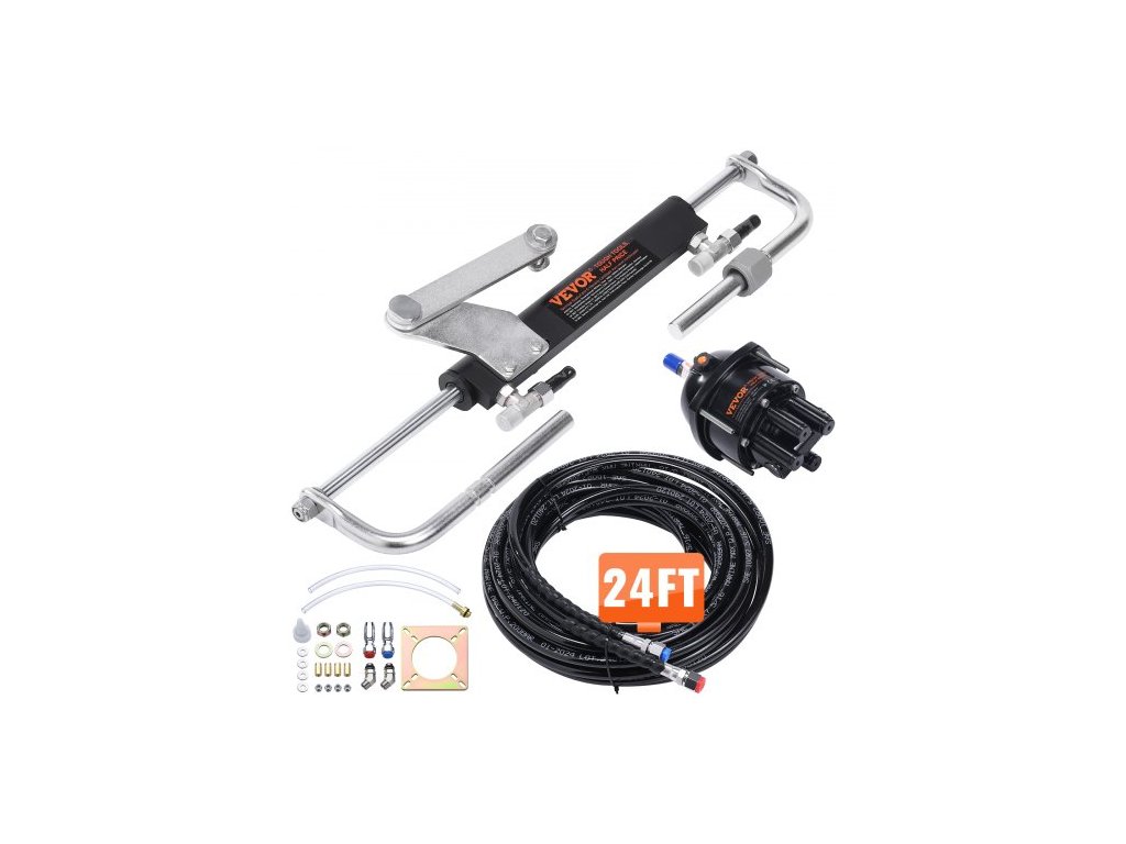 Hydraulická sada řízení pro přívěsný motor VEVOR, 90 HP, hydraulický systém řízení pro lodní čluny, s kormidelním čerpadlem, obousměrným zamykacím válcem a hydraulickou hadicí řízení 731,5 cm, pro jednomotorové čluny s jednou stanicíSada hydraulického systému řízení přívěsného motoru 90 HP