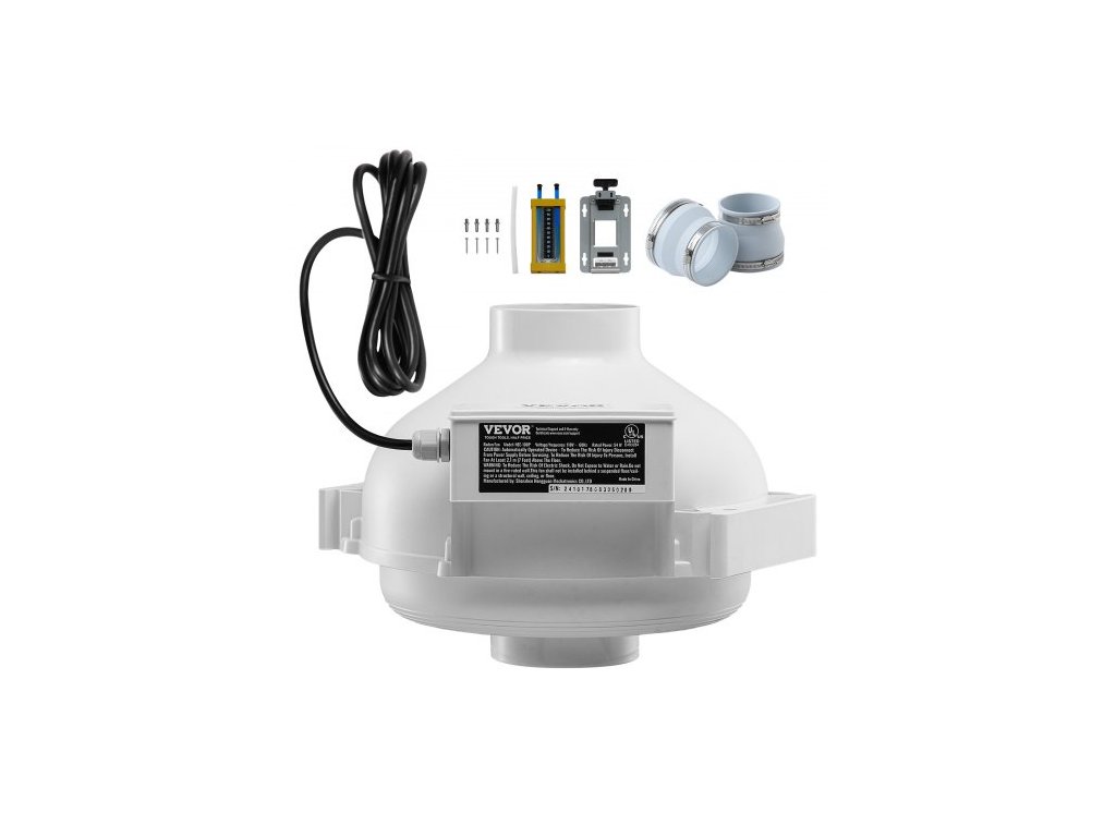 Instalační sada radonového ventilátoru VEVOR 4 až 4,5 palce, tichý systém ventilátoru pro zmírnění radonu o výkonu 260 CFM se 2 spojkami, indikátor tlaku, vodotěsný potrubní ventilátor pro odsávání vnitřních i venkovních prostorů