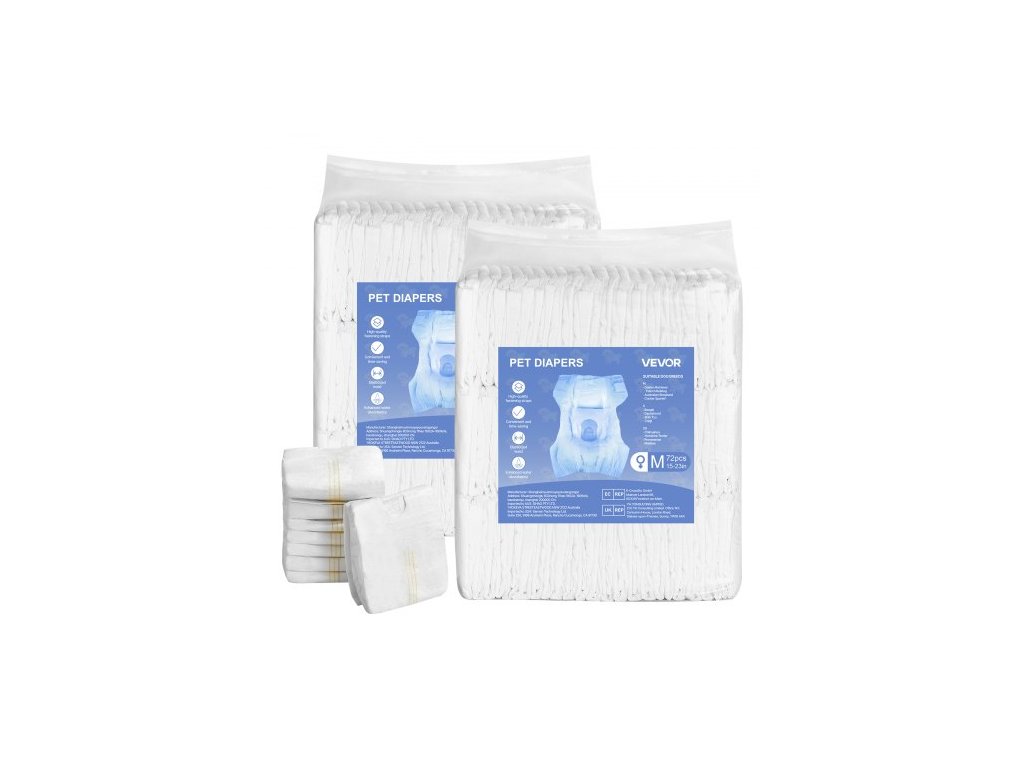 Jednorázové plenky VEVOR pro psy, super savé plenky pro feny, 360° nepropustné plenky pro feny s indikátorem vlhkosti pro období říje, výcvik, inkontinenci - M, 144 kusů (2 balení po 72)