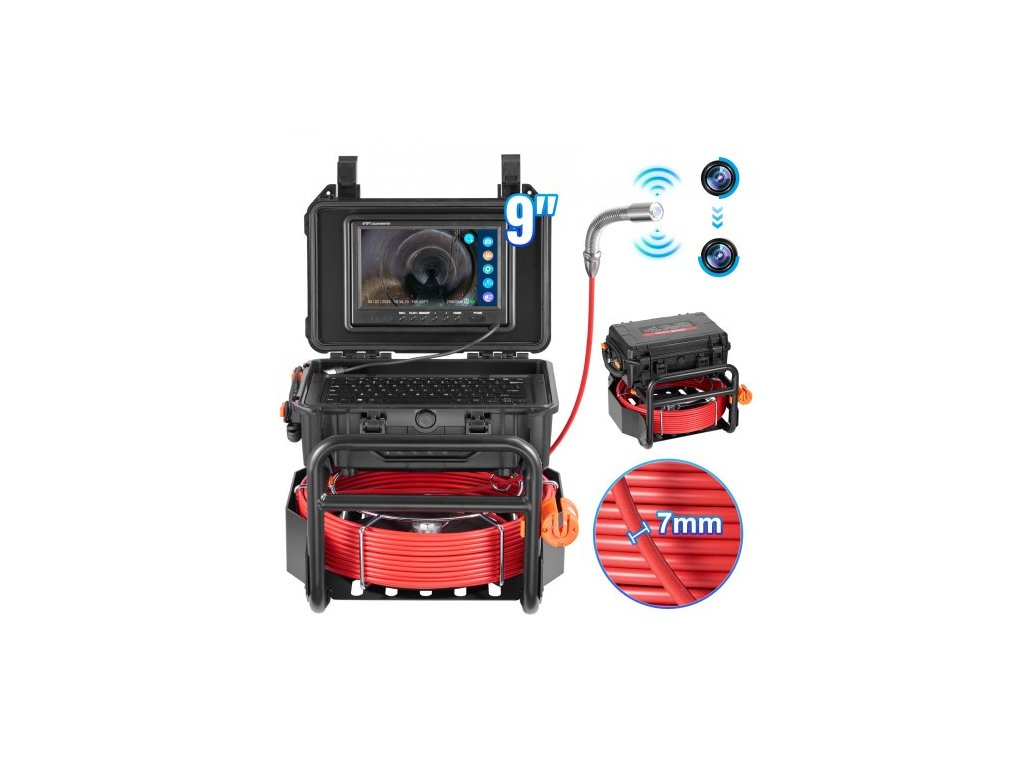 Kanalizační kamera VEVOR, 50 m, samonivelační kamera do odpadu s 512Hz vysílačem, čítačem vzdálenosti, 9" obrazovkou, 1080P HD, instalatérská kamera s osvětlením - 12 LED a 32GB kartou pro potrubí