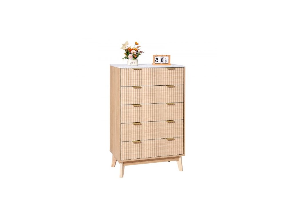 Komoda VEVOR s 5 vroubkovanými zásuvkami, dřevěná komoda s posuvným a protipřevrhovacím mechanismem, moderní minimalistická komoda, úložný prostor do šatny do obývacího pokoje, chodby, ložnice, vstupní haly, světlé dřevoMultifunkční komoda se zásuvkami