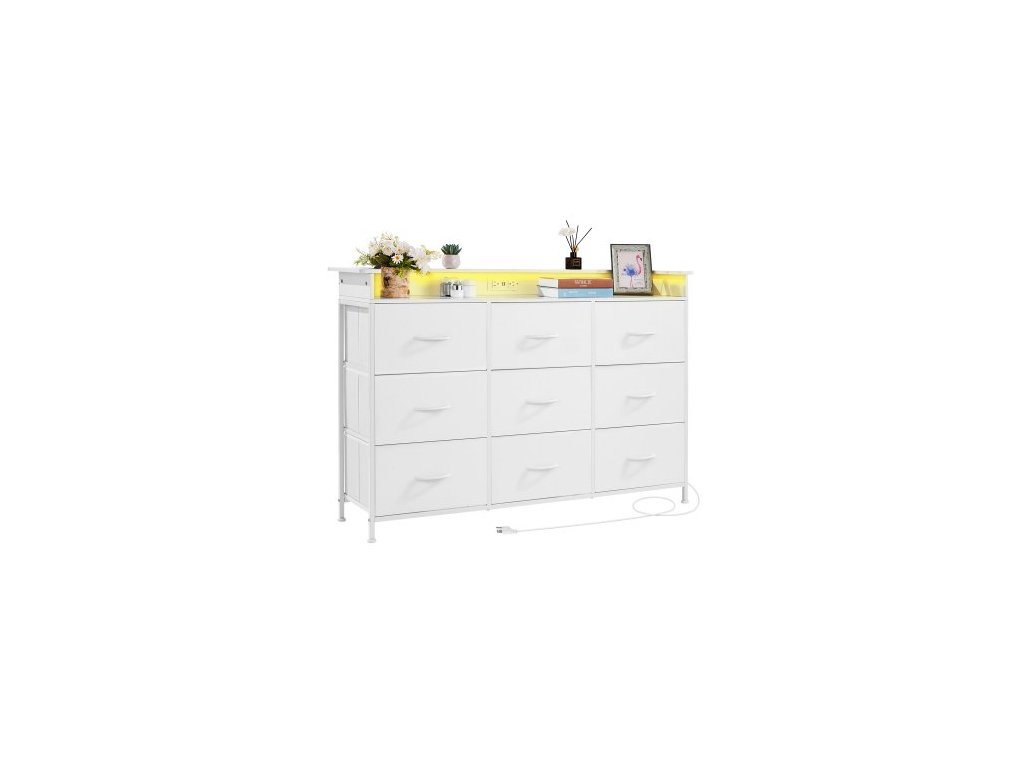 Komoda VEVOR s 9 zásuvkami, vysoká zásuvková komoda s košem na látky, úložné zásuvky do skříně s pevným kovovým rámem, LED osvětlení a vestavěná zásuvka, věž na úložné látky do ložnice, chodby, skříně, bíláNastavte náladu
