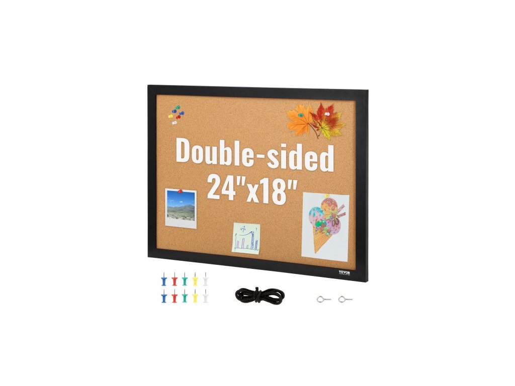 Korková nástěnka VEVOR, 24 x 18 palců, oboustranná nástěnka s rámečkem z MDF se samolepkami, vizuální nástěnka obsahuje 10 připínáčků, pro vystavení a dekoraci v kanceláři, doma i ve školeDvojitá oblast pro vyvěšení