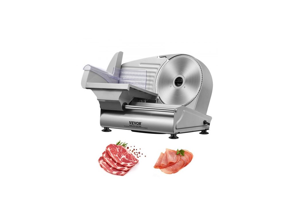 Kráječ masa VEVOR, elektrický kráječ na lahůdky 180 W s čepelí z nerezové oceli SUS420 o průměru 19,1 cm a krytem čepele, nastavitelná tloušťka 0 - 1,5 cm pro domácí použití, snadno se čistí, krájí maso, chléb, šunku a sýrEfektivita krájení masa