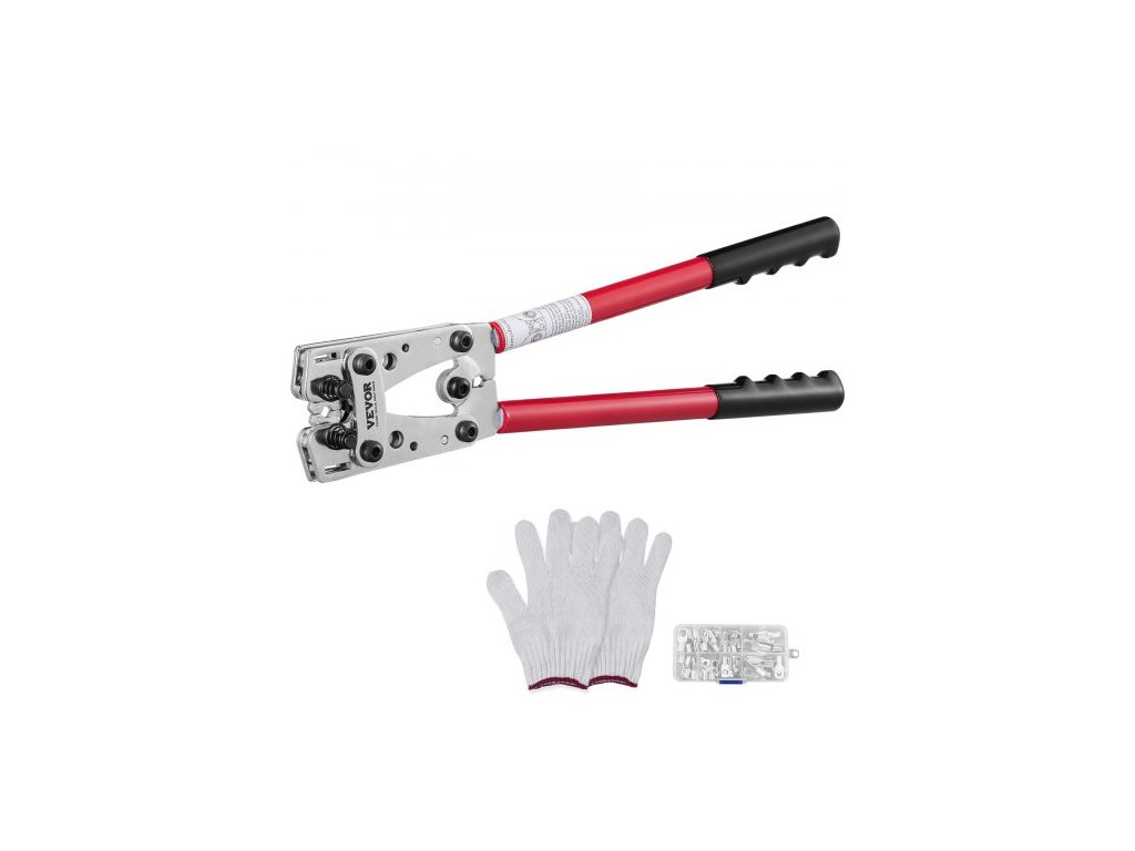 Krimpovací nástroj na bateriové kabelové koncovky VEVOR, krimpovací kleště na hliníkové konektory 10-1/0AWG, s 60 ks hliníkových kroužkových konektorů, 6 velikostí vodičů, krimpovací matrice, pro vysoce odolné kabelové koncovkyŠiroký rozsah krimpování