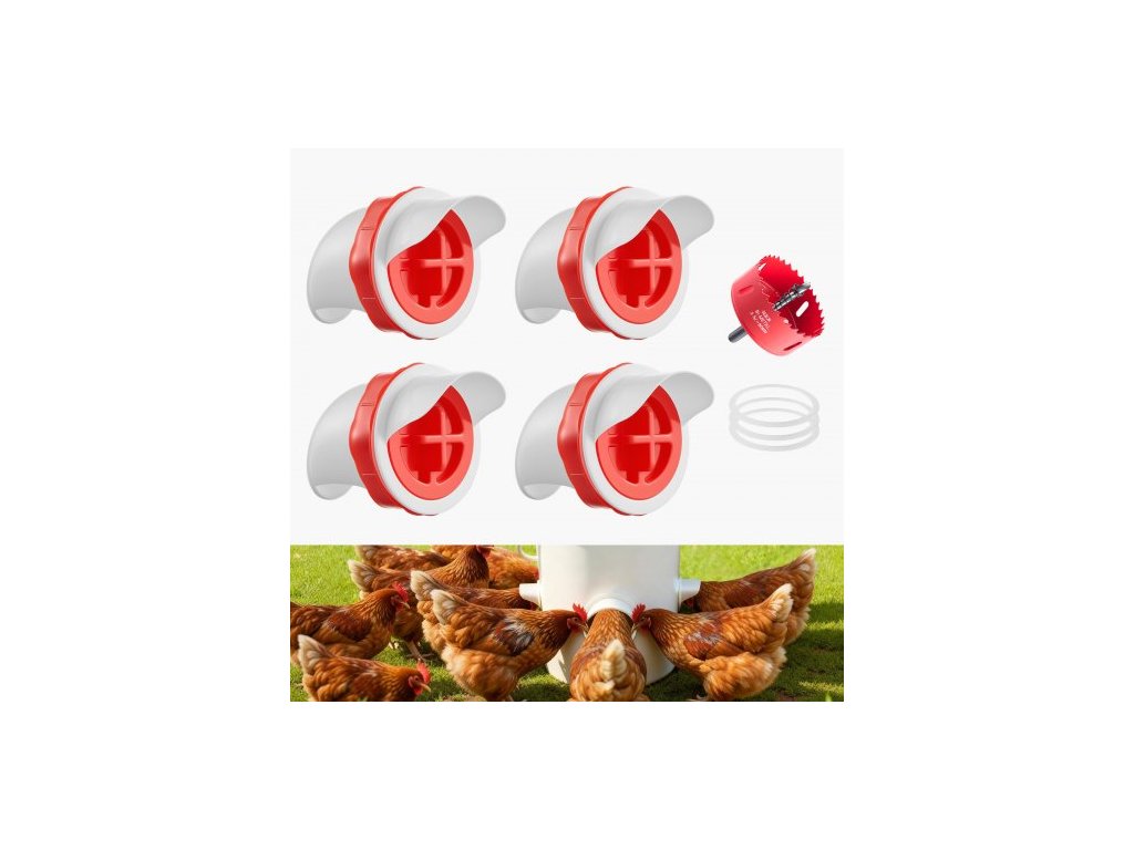 Krmítko pro kuřata VEVOR pro kutily, 4 krmné otvory, odolné proti dešti s krytem, bez odpadu, sada pro automatické gravitační krmení s robustní ocelovou děrovou pilou, gumový těsnicí kroužek, pro kbelíky, sudy, koše, žlabyEfektivní automatický podavač pro kutily