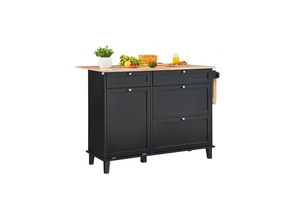 Kuchyňský ostrůvek VEVOR, barový pult s dřevěnou deskou 50" s výklopnou skříňkou na odpadky o objemu 10 galonů, farmářský jídelní stůl do obývacího pokoje s výklopnou deskou, věšák na ručníky a zásuvka, černý