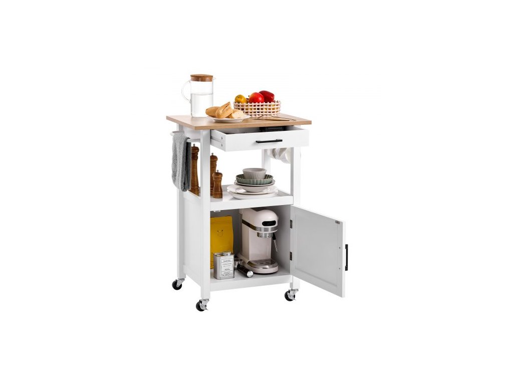 Kuchyňský ostrůvek VEVOR s jednodveřovou skříňkou, mobilní vozíky se zásuvkou, věšák na ručníky, háčky, přenosný stůl na otočných kolečkách, malé kávové ostrůvky, stojan na mikrovlnnou troubu do jídelny, 45x59cm, bílýZásuvka s hladkým výsuvem