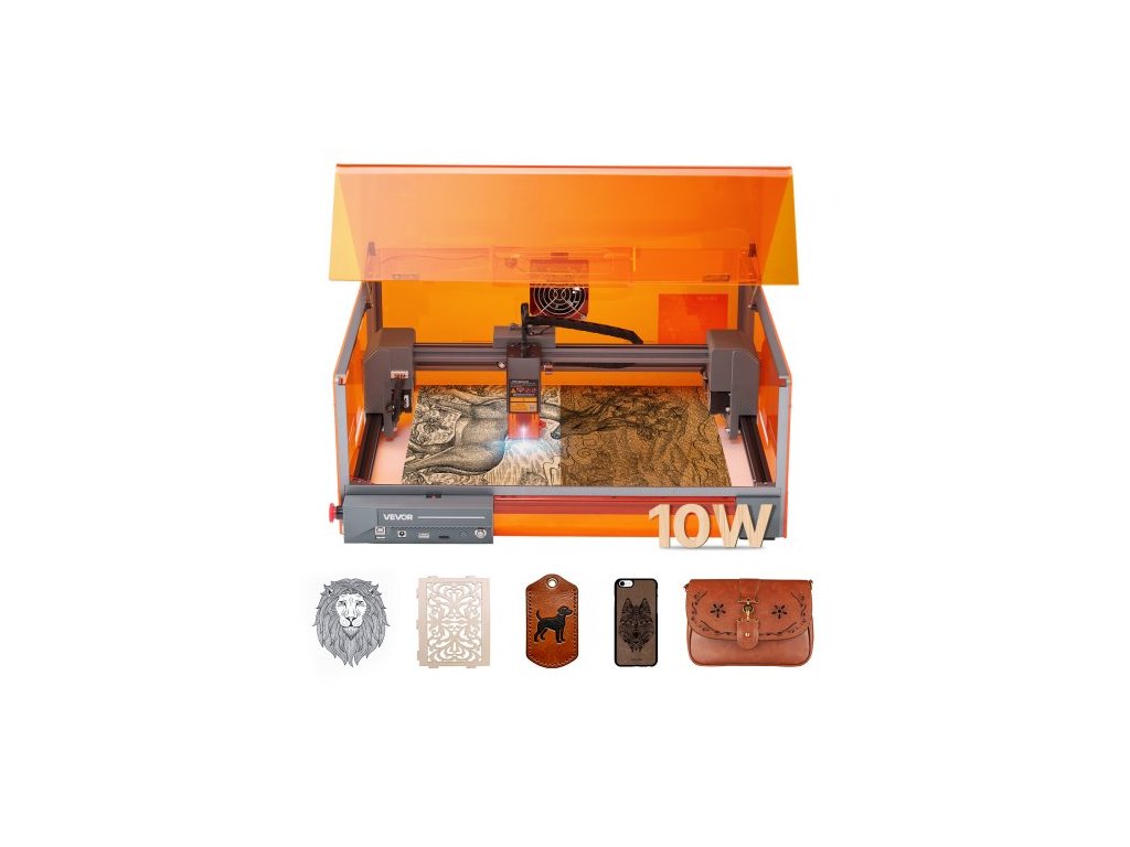 Laserový gravírovací a řezací stroj VEVOR, 10 W, laserový gravírovací a řezací stroj s krytem, laserový řezací gravírovací stroj, pracovní plocha 300 x 300 mm, 7000 mm/min, pro dřevo, kůži, sklo, některé kovy, třída 1Plně uzavřená ochranná konstrukce