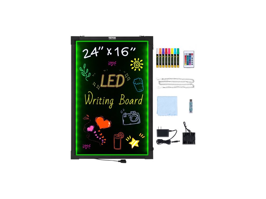 LED tabule pro psaní zpráv VEVOR, 24 x 16 palců, osvětlená mazatelná tabule, menu s neonovým efektem, rýsovací tabule s 8 fluorescenčními křídovými fixy a dálkovým ovládáním, testováno dle norem UL16 barev + 4 režimy + 5 úrovní jasu