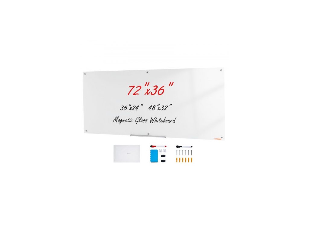 Magnetická skleněná bílá tabule VEVOR, tabule s mazáním za sucha 72"x36", nástěnná velká bílá skleněná tabule bez rámu, s odkládacím stolkem na fixy, gumou a 2 fixy, bílá