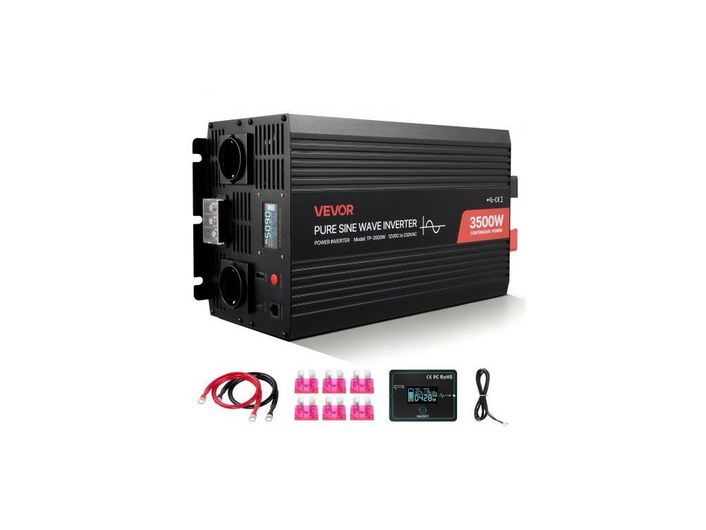 Měnič VEVOR 3500W, měnič 12V DC na 230V AC s čistou sinusovou vlnou, solární nabíječka do auta s LCD displejem, dálkovým ovládáním, USB portem, 2 AC zásuvkami, portem typu C, pro karavany, nákladní vozy, venkovní kempování