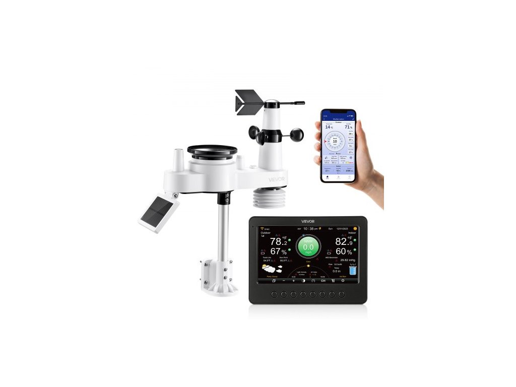 Meteorologická stanice VEVOR 7 v 1 s Wi-Fi, 177,8 mm TFT displej, bezdrátový solární venkovní senzor, srážkoměr, pro vnitřní i venkovní použití s předpovědí počasí, rychlostí větru, směrem, teplotou, vlhkostí a srážkami.Jasný displej