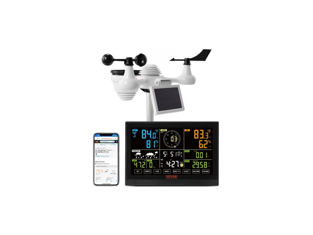 Meteorologická stanice VEVOR 7 v 1 s Wi-Fi, 19,1cm (7,5") barevný displej, domácí meteorologická stanice pro vnitřní i venkovní použití, se solárním bezdrátovým venkovním senzorem, upozornění na alarm, pro teplotu, vlhkost, rychlost/směr větru, déšť7v1 senzor
