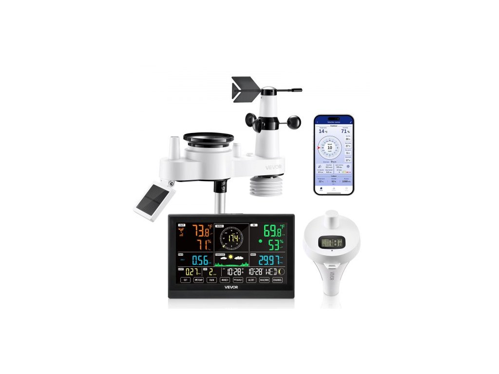 Meteorologická stanice VEVOR 7 v 1 s Wi-Fi a aplikací, displejem 190,5 mm, bezdrátovým solárním venkovním senzorem, s bazénovým teploměrem, srážkoměrem, pro vnitřní i venkovní použití s předpovědí počasí, rychlostí větru, teplotou bazénu