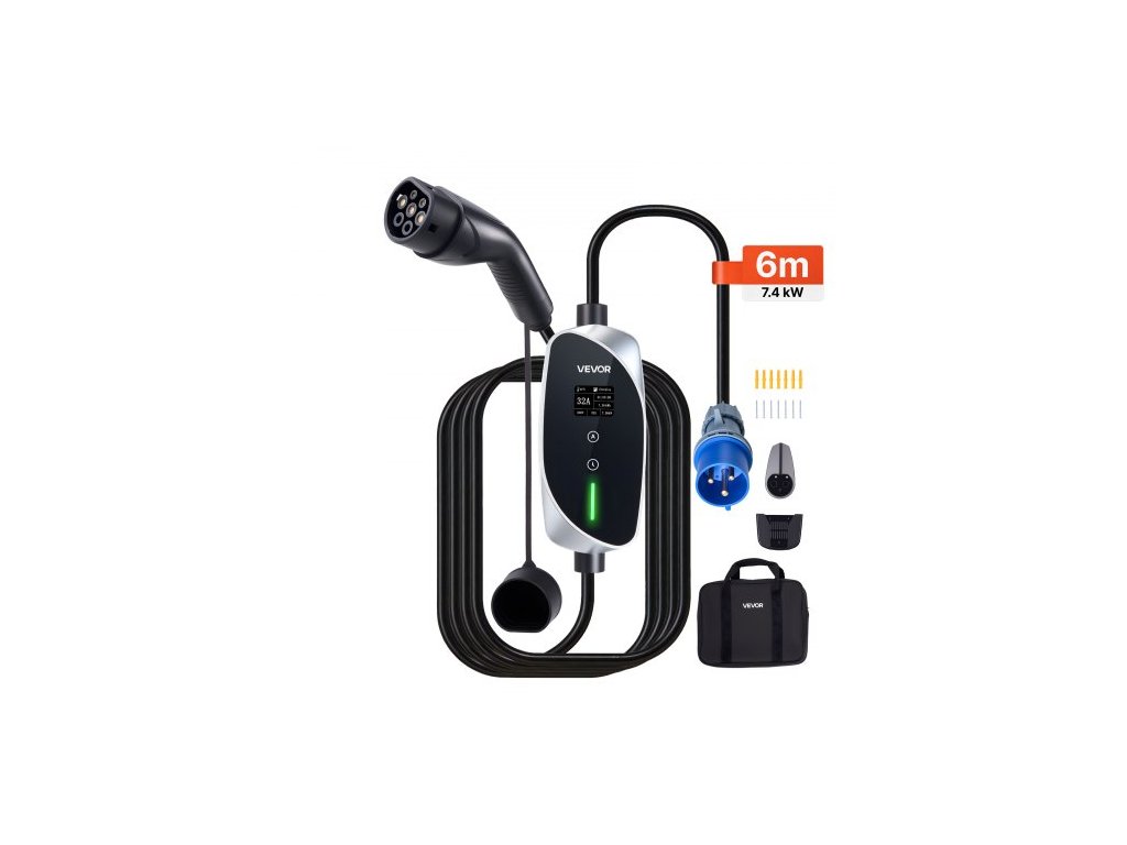 Mobilní nástěnná nabíječka VEVOR, 7,4 kW 32A, přenosná nabíječka pro elektromobily typu 2, jednofázová nabíječka do auta pro elektromobily s 6m nabíjecím kabelem, zástrčka CEE, LCD displej, nastavitelná nabíjecí stanice pro elektromobily, ovládací…