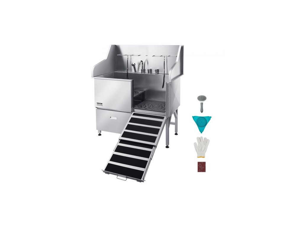 Mycí stanice pro psy VEVOR 304 z nerezové oceli, vana na stříhání domácích mazlíčků o průměru 127 cm s protiskluzovou rampou s nízkým sklonem, úložným prostorem, kohoutkem na teplou a studenou vodu, univerzální vana pro stříhání, vhodná pro všechny…