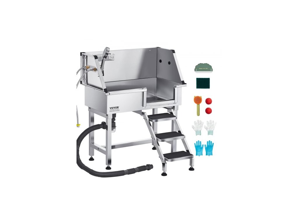 Mycí stanice pro psy VEVOR z nerezové oceli o průměru 86,4 cm, vana na péči o domácí mazlíčky s kohoutkem na teplou a studenou vodu, sprchová hlavice, umyvadlo pro domácí použití, vhodné pro malé kočky a psy, protiskluzové schody (pravé dveře)