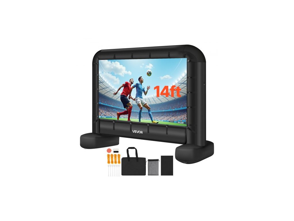 Nafukovací filmové plátno VEVOR 14 stop, omyvatelné nafukovací projekční plátno z 600D s přenosným úložným vakem, snadno nastavitelné promítání filmů 16:9 pro venkovní zahradu, domácí kino, tematickou párty, zábavu u bazénu